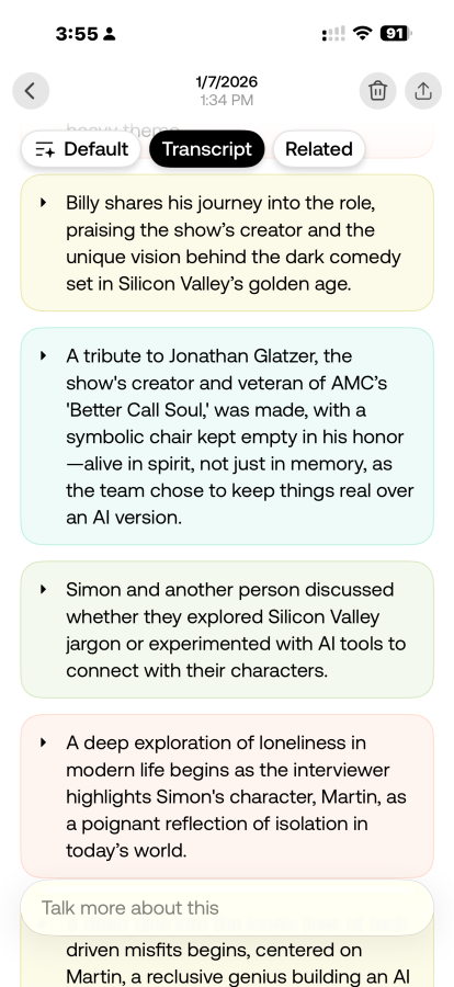 For example, an interview might be split into the introduction, product details, industry trends, and other topics. Each section is color-coded, making it easy to scroll through. Tap any section, and you can read the full transcription.